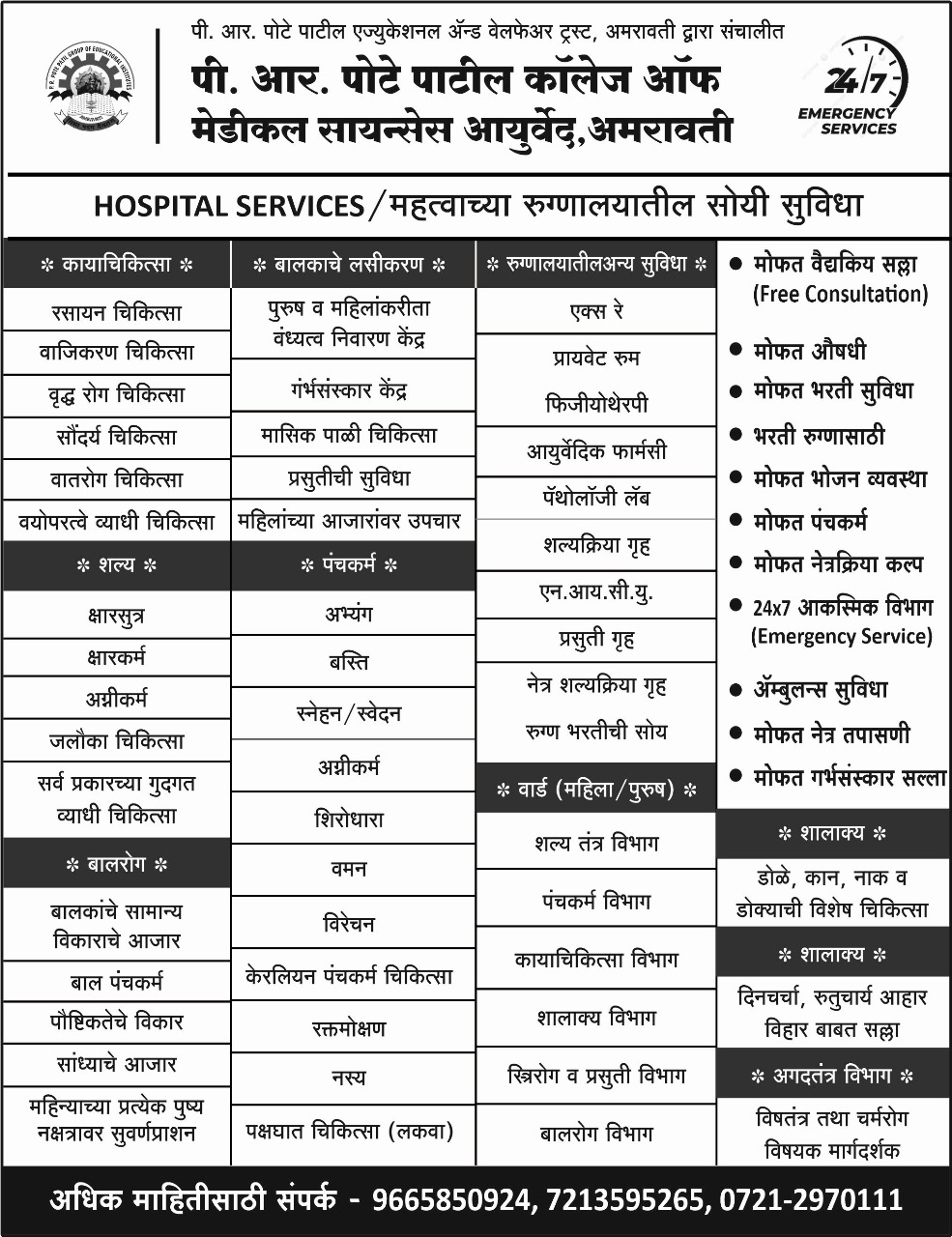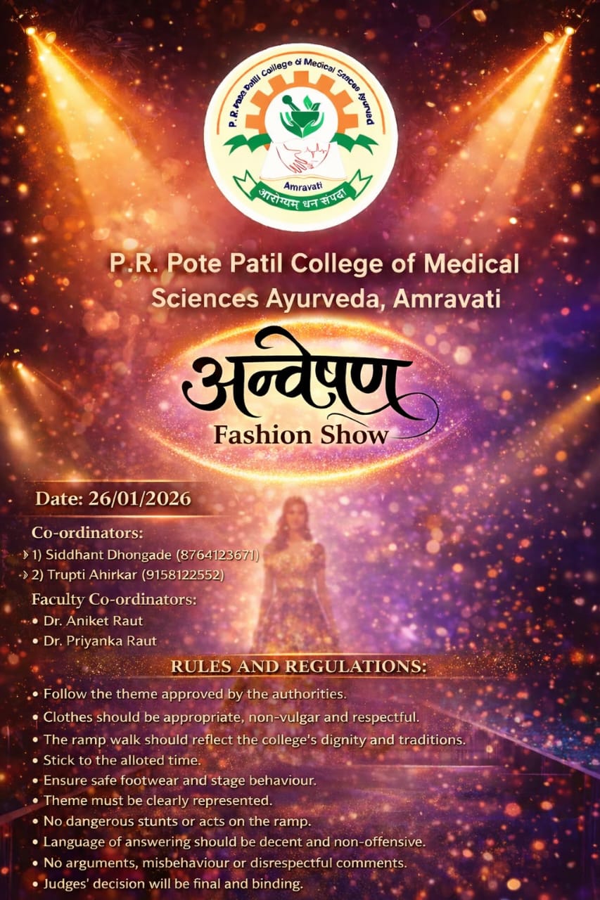 P. R. Pote Patil College of Medical Sciences Ayurved run under the umbrella of P. R. Pote Patil Group of Educational Institutes, Amravati having huge campus of professional course engineering, MBA, Pharmacy, Agriculture along with Ayurved Stream. P. R. Pote Patil Group of Educational Institutes, Amravati covers almost 30 acres area in Heart of Amravati city and attached 2000 housing Society of Pote estate. Campus having well planned infrastructure, having 60 bedded hospital with well equipment, ICU, Operation Theaters, X-Ray, Pathology Unit & Panchakarma Unit.